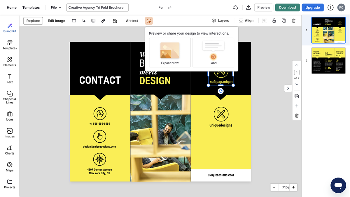 On the interactive side, Venngage has some impressive options for creating brochures. You can embed videos, add hotspots to images, create quizzes and forms, insert clickable links, and even generate QR codes or labels to reveal extra information. However, Venngage doesn’t support adding animations to brochures.
