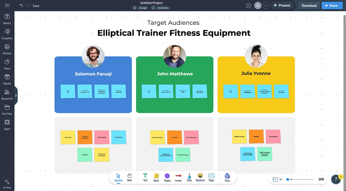 Pro Tip: Don’t reinvent the wheel and save time on the user persona process. Open up one of our easy-to-customize user persona whiteboard templates and use the sticky notes to fill in the content.