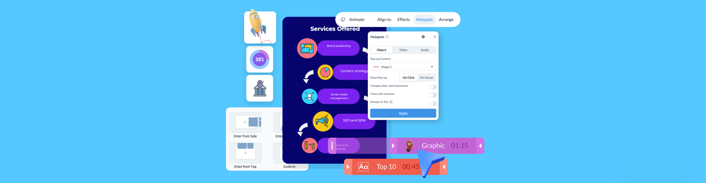 One of Genially’s biggest strengths is animation. You can apply entry animations, hover effects and continuous motion to charts, icons and visuals with just a few clicks. This makes it easy to turn static training slides into dynamic, engaging experiences.