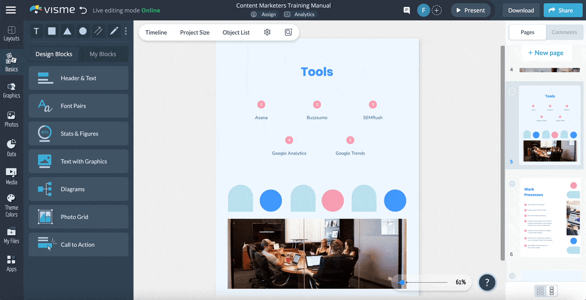 Visme helps you design stunning, professional-looking training materials quickly and easily. Access thousands of ready-to-go templates made especially for corporate training purposes and customize them using a drag-and-drop editor.