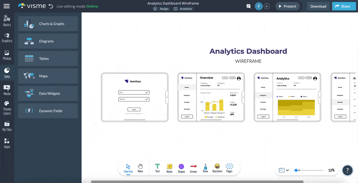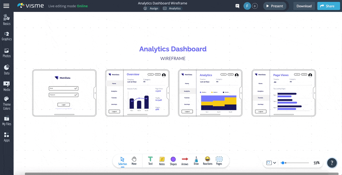 Similar to the ad analytics wireframe template, this analytics dashboard wireframe template gives you an overarching view of business data. It's a blueprint for handling complex data sets across various business functions like website traffic, landing pages, marketing funnel, customer journey and more.
