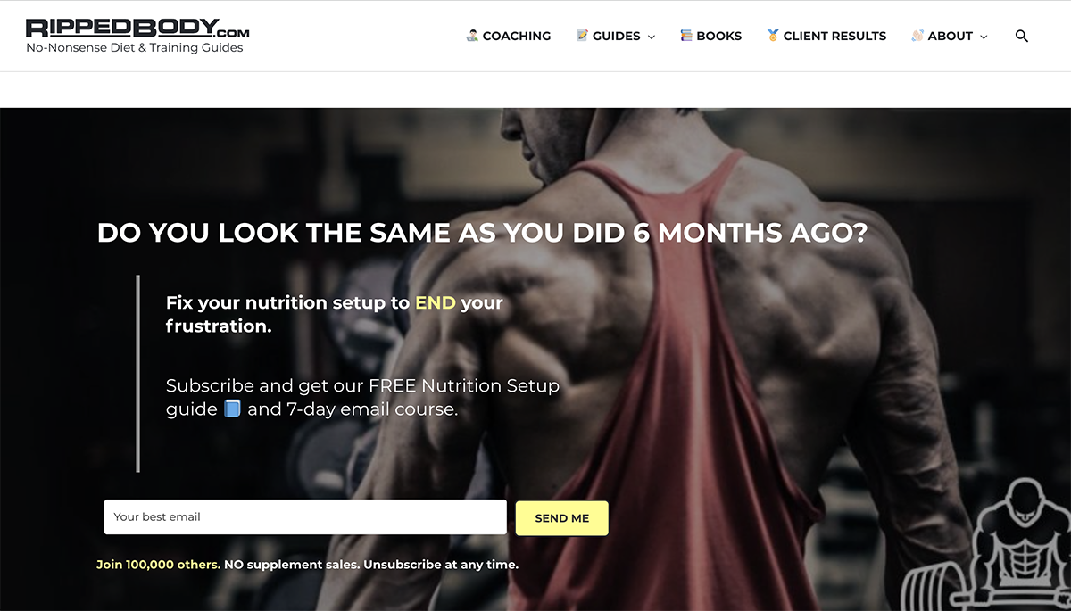 The form below is an excellent example of a newsletter form with a great design. Ripped Body employed a simple but stunning style with this newsletter design. Not only did Ripped Body keep its identity constant, but it also used contrasting colors and a captivating image to make the message impossible to dismiss.
