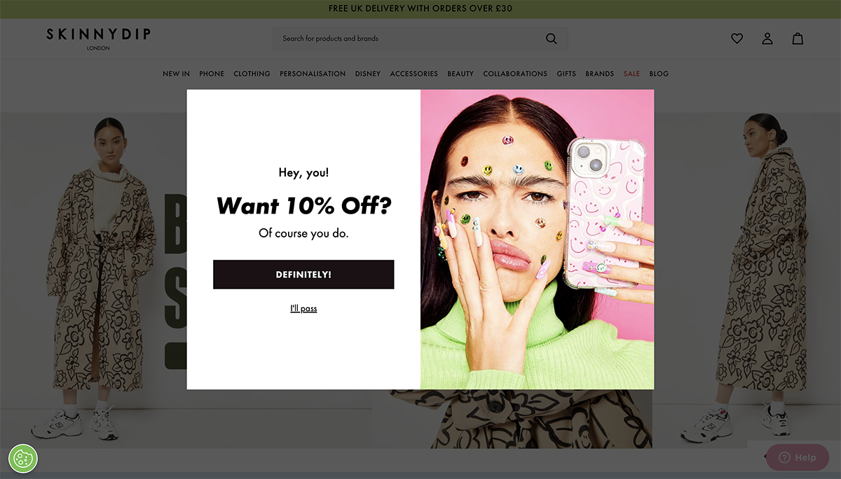 SkinnyDip has a pop-up that showcases a 10% discount as a thank-you gift for signing up. It also has a footer email capture form that appears on every page.