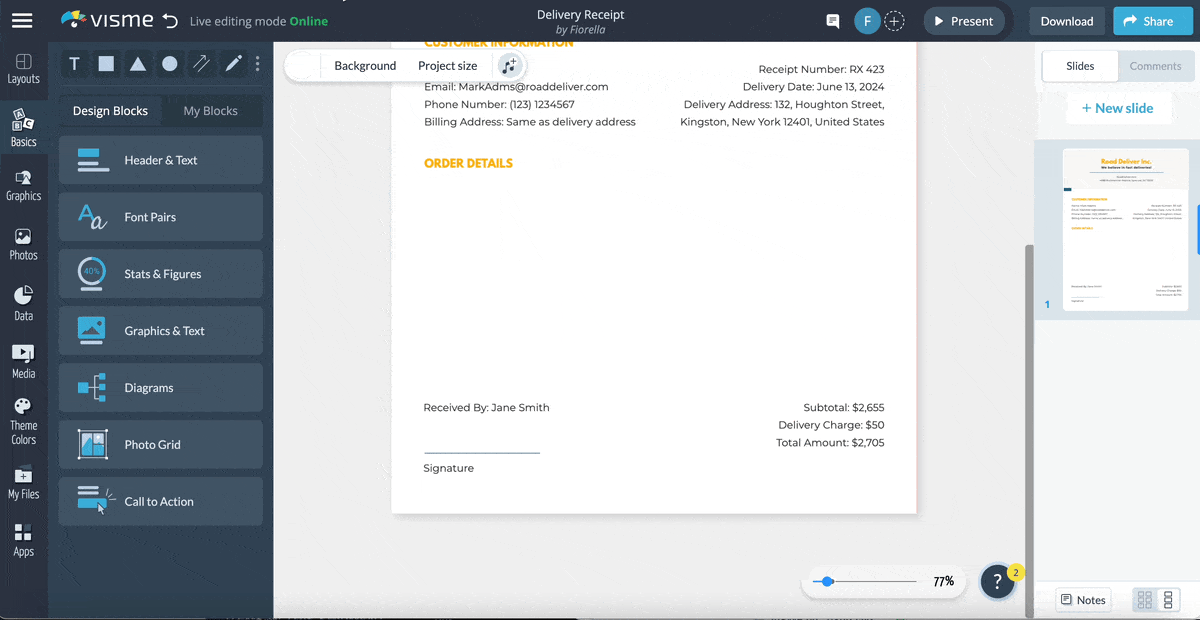 Visme templates offer a space to include the percentage or amount of any additional fees like service tax, shipping fee, etc. You can also include a discount or promo code.