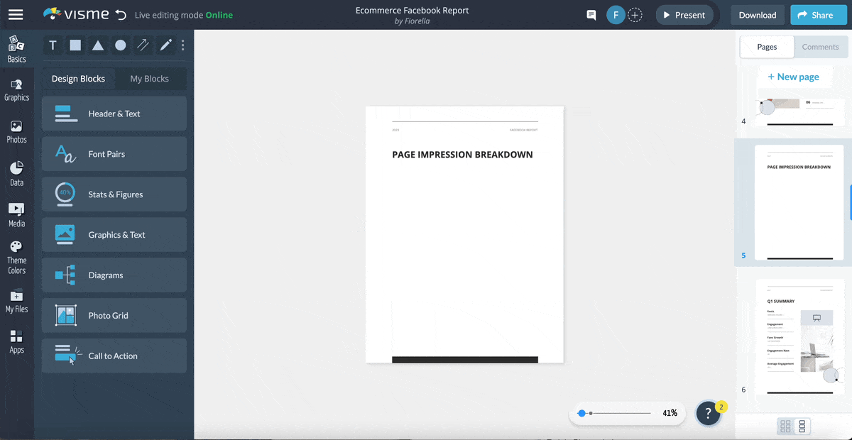 The Visme infinite whiteboard has more than enough space to create an ad performance dashboard exactly how you want it. Use the bounding boxes as section separators and KPI grouping.