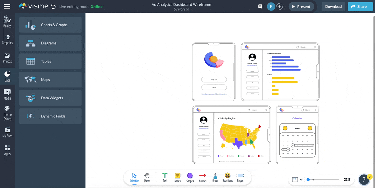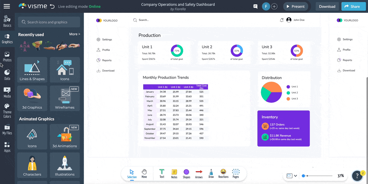 Collaborate with your team effectively to build and keep the dashboard up to date. Many of the dashboard templates in Visme are accessible on our infinite whiteboard, where your team can work together without limits.