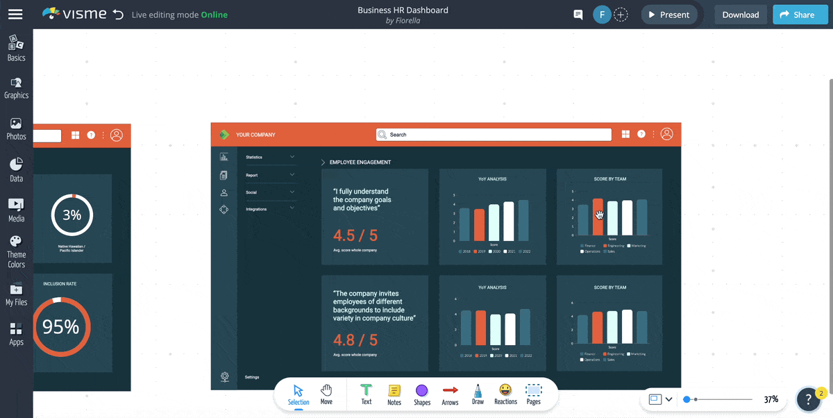 Ask team members to give feedback about the choice of KPIs and their layout. Do they achieve in highlighting performance for your dashboard’s objective? Collaborators can leave digital post-its with comments, add freehand notes with the Visme freehand tool, or add shapes, arrows and speech bubbles.