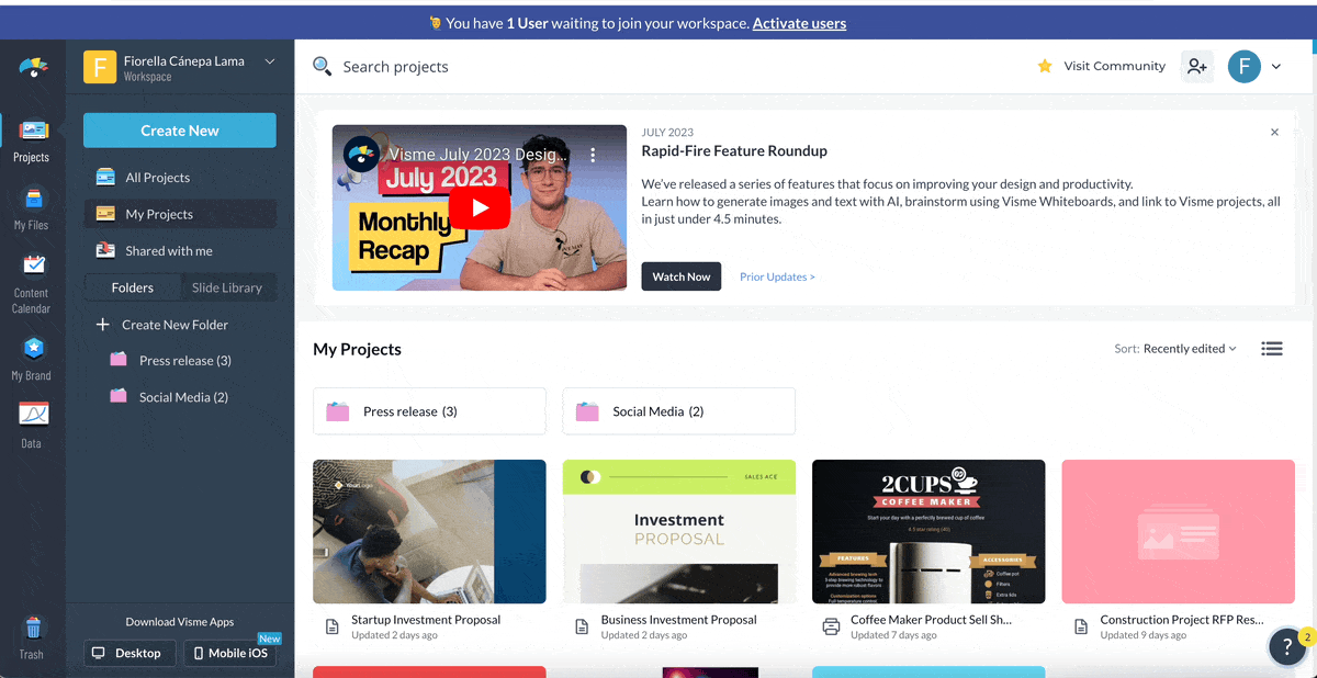 Sign up for a new Visme account or log into your account if you’re an existing user. Fill in the details required in the form and you’ll be redirected to the Visme dashboard.