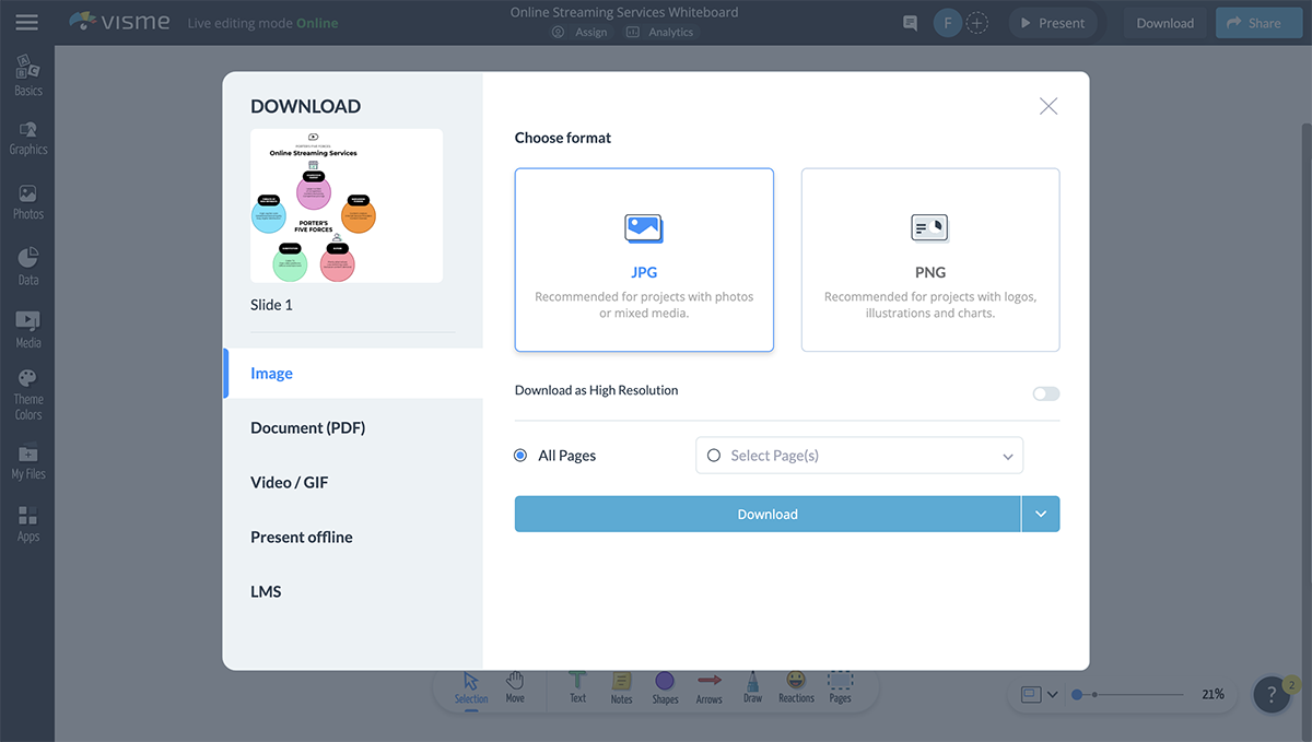 Share your design with your stakeholders by generating an online link. Download it as a high-resolution JPEG, PNG, PDF or HTML5 file and share it offline.