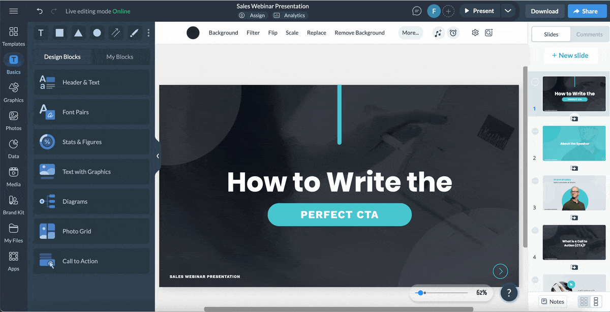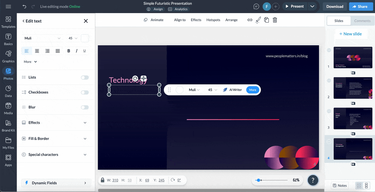 There are several tools in the Visme editor to help you with this step. For instance, use Visme’s AI Writer to finesse or summarize text so it makes more sense with your slide content.