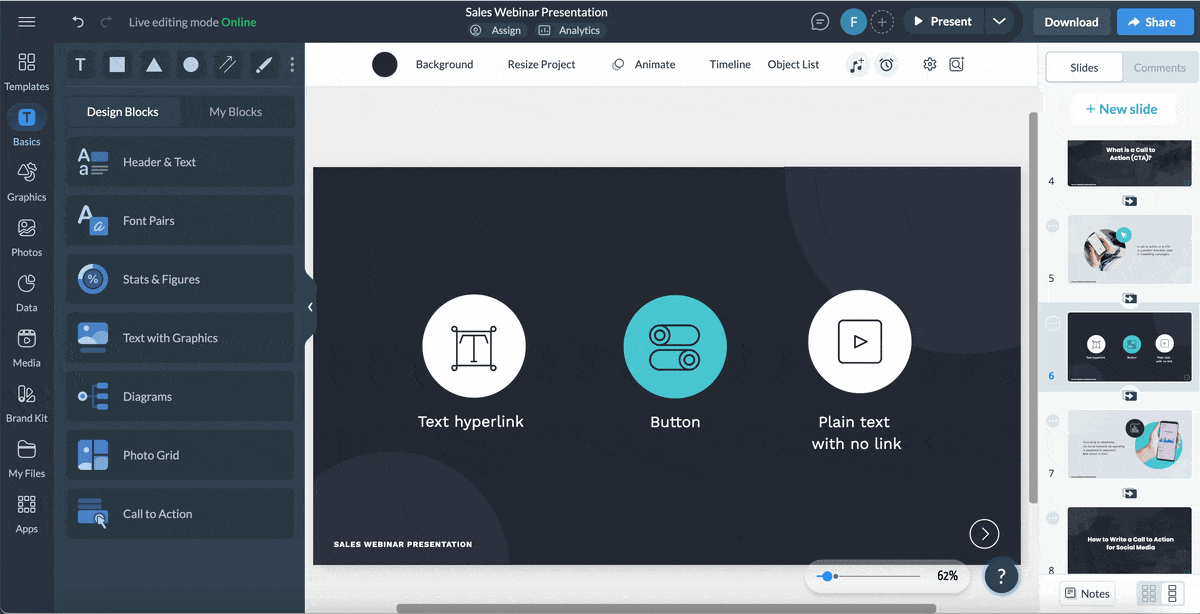 Some presentation tools integrate reading order tools; Visme has one, too. The ideal way to create an effective reading order is to add the content to the slide in the order you want it to appear. This is why it’s essential to have an outline or even a storyboard to help you build each slide with the reading order in mind.