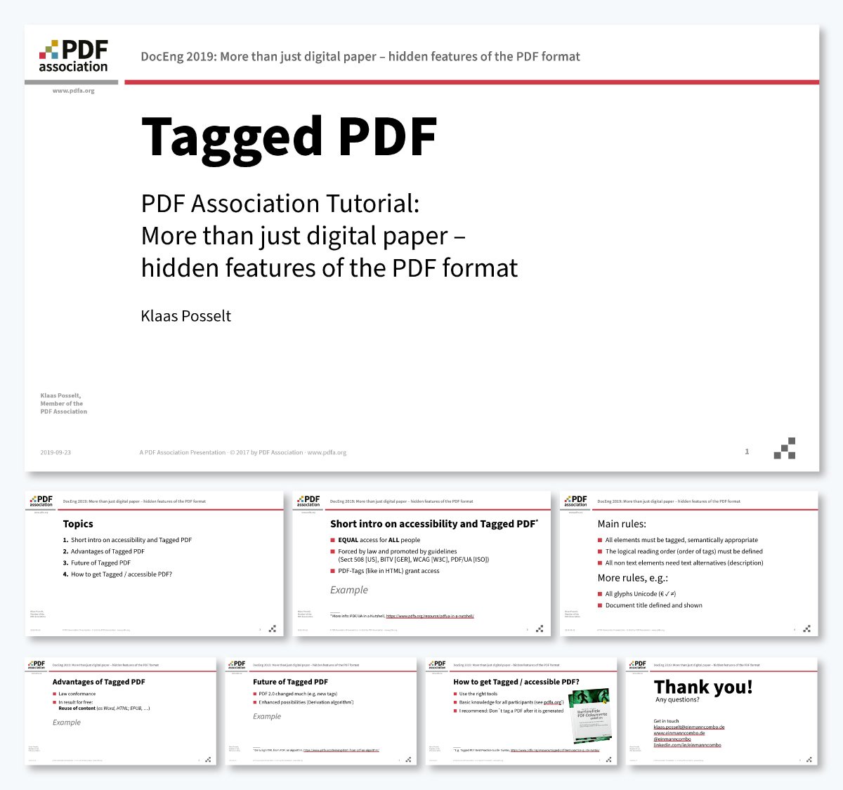 This presentation from the PDF Association is a bit of a mixed bag. The content in the PDF accessibility presentation slides is well-designed for accessibility. Still, since they use a master design for every slide with repeating text, the screen reader reads it all at the start of each slide.