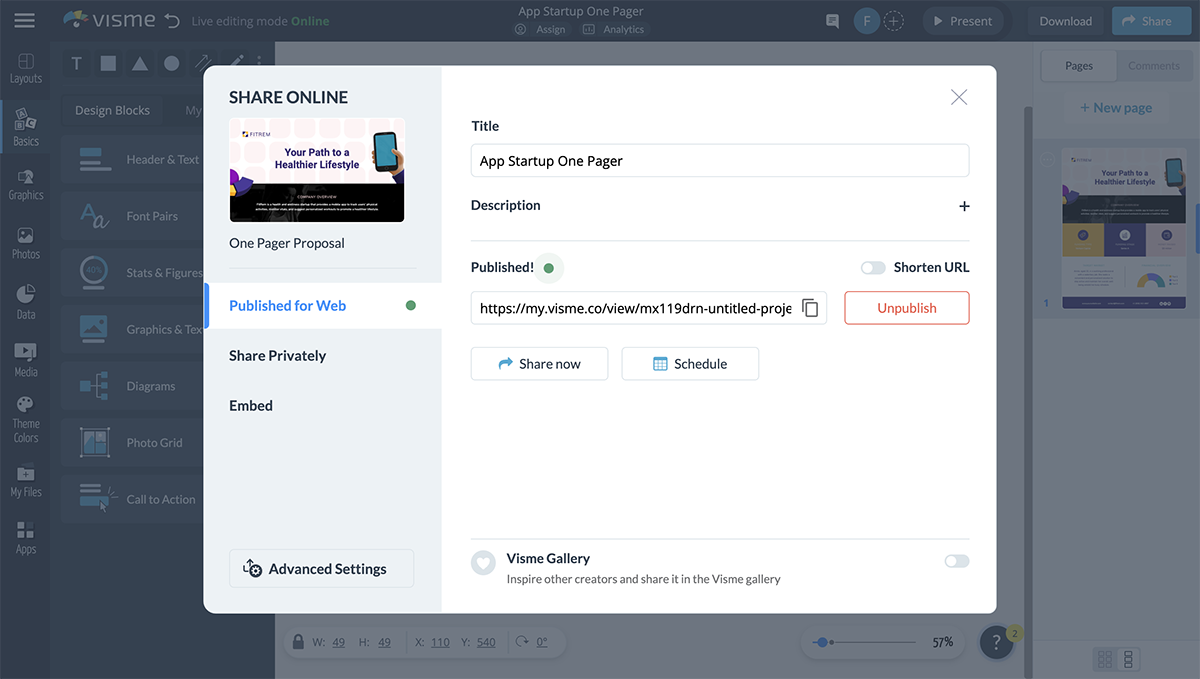 Interactive one-pagers must be shared as live Visme links so the viewer can experience all the interactive features. To generate this link, you must first publish the project online. The beauty of live Visme links is that they can be customized even after they’ve been shared, without the need to send the link again.