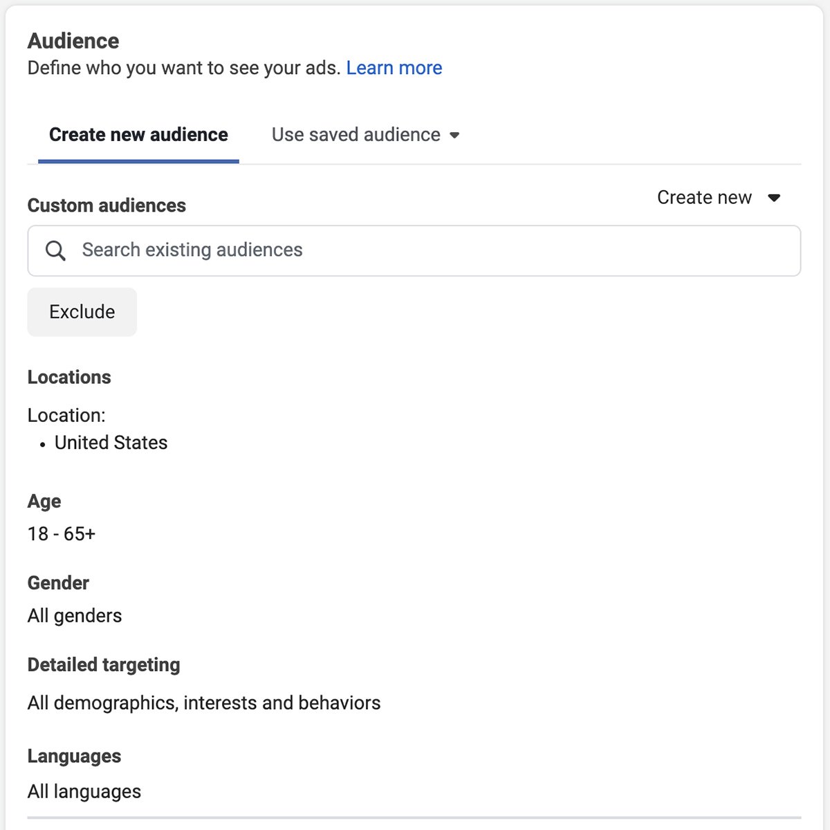 Em seguida, você definirá as informações sobre o público para o qual seu anúncio será exibido. Você segmentará com base na localização, idade, sexo, interesses, comportamento e outros dados demográficos.