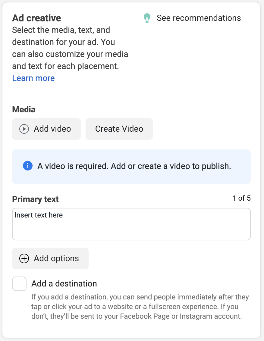 Falaremos mais sobre as práticas recomendadas para criar seu vídeo em breve, mas é aqui que você enviará seu anúncio em vídeo. Você pode selecionar Adicionar vídeo para carregar seu vídeo existente ou selecionar Criar vídeo para permitir que o Facebook transforme automaticamente as imagens do produto em um vídeo.