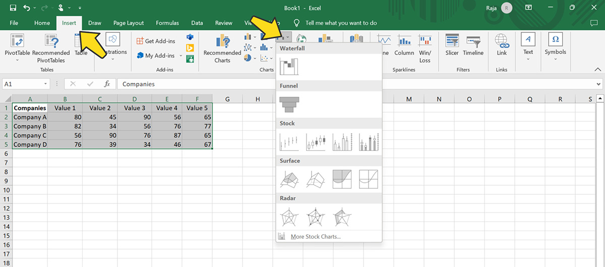 Click the "Insert" tab in the Excel ribbon. In the "Charts" group, click on the small arrow beside the "Waterfall" icon to open the "Insert Chart" dialog.