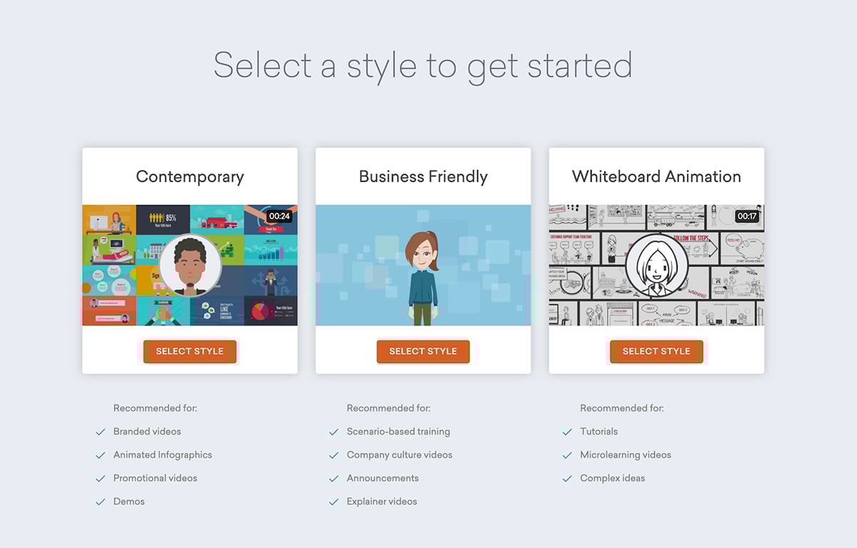 However, they do offer you a theme to start with, which is a great help. You can choose from three styles; contemporary, business-friendly and whiteboard animation.