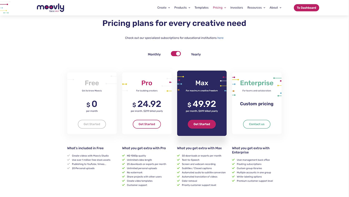 Moovly offers a free plan that’s robust enough to help you understand the editor and features. To access more features, you need to upgrade to a premium plan.