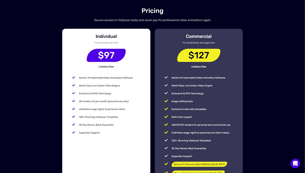 Viddyoze doesn’t offer a monthly or yearly subscription. They offer two types of licenses with lifetime access: