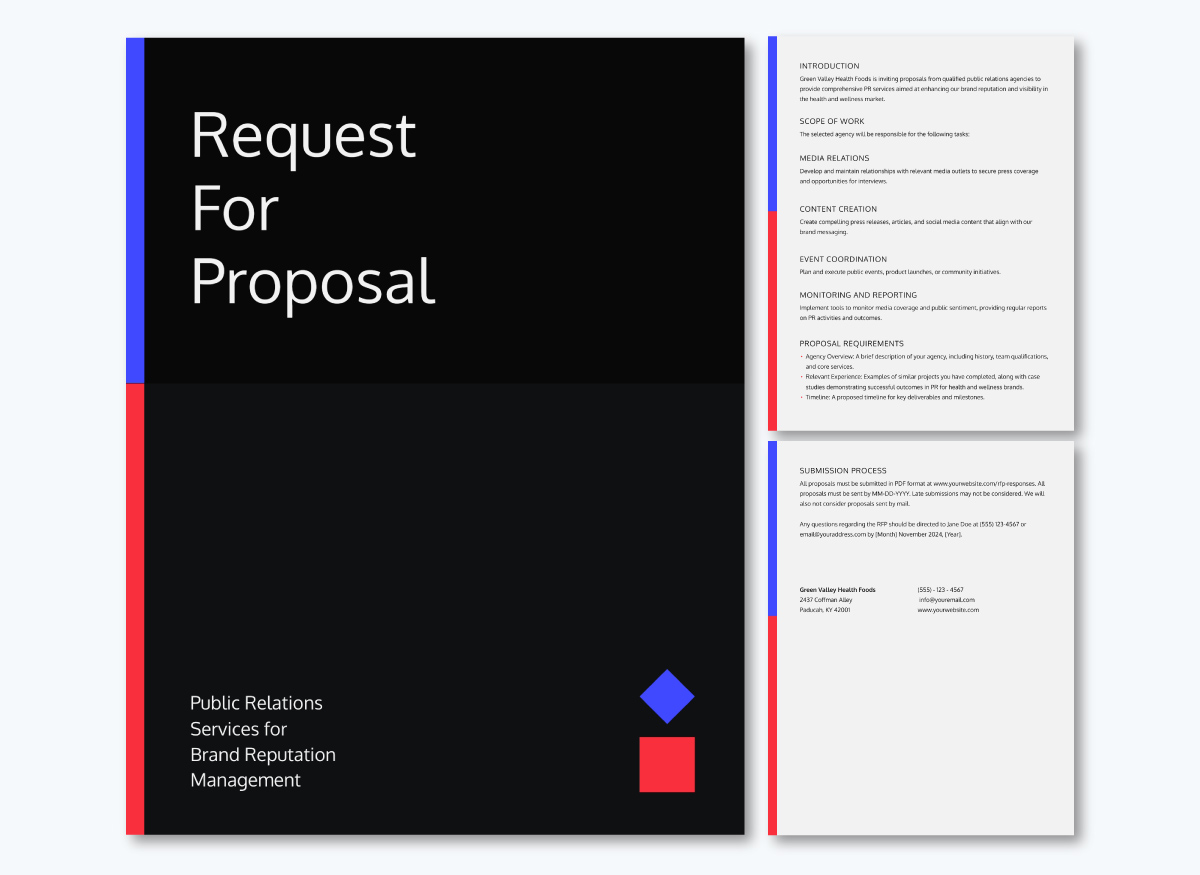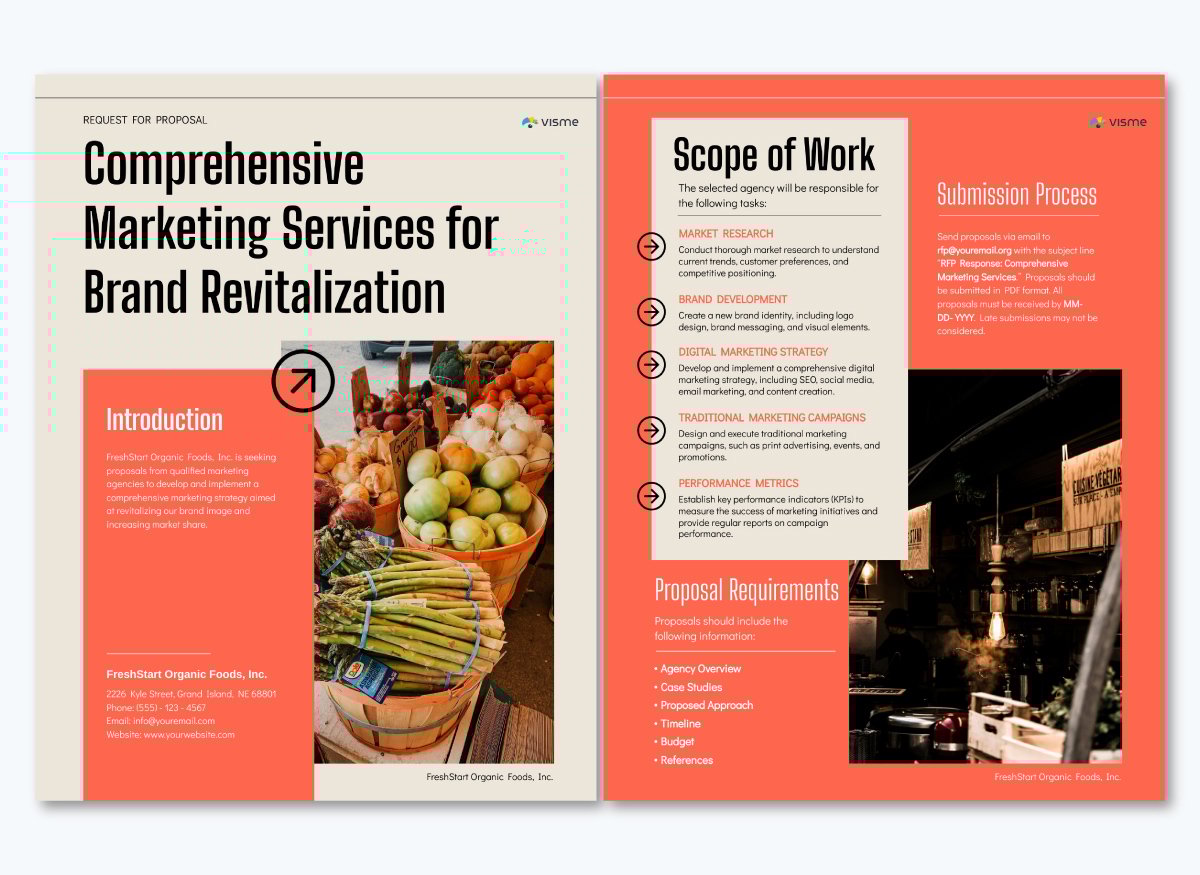 An RFP can be highly visual or look more like a document, but it will always include a brand asset like a logo or brand colors.
