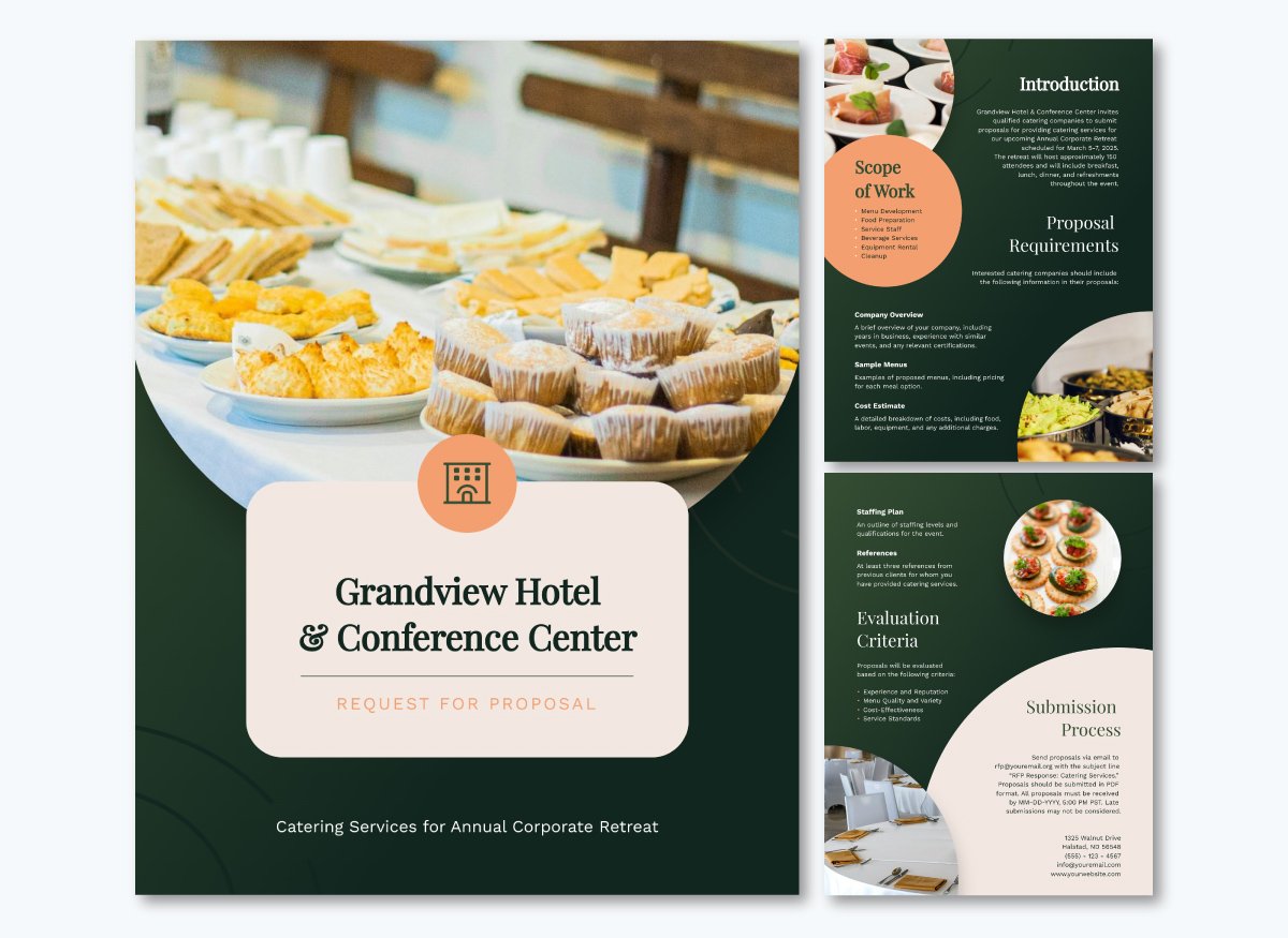 This Request for Proposal template is designed to help a conference center find and hire a catering service agency. Vendors are requested to supply menu creation, food preparation and personnel hire for an annual conference. All essential information is laid out on three beautifully designed pages.