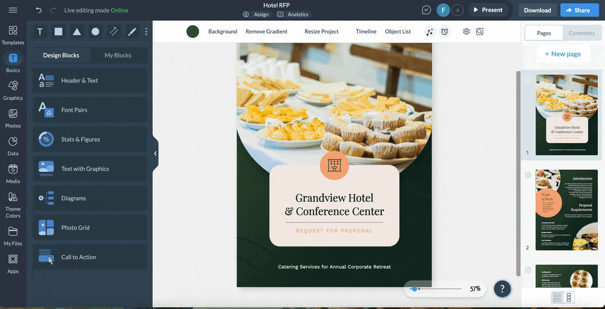 Visme enhances collaboration among team members by providing a centralized platform where everyone can contribute in real-time. Its intuitive interface allows team members to easily share ideas, make edits and track changes with the workflow feature. With these built-in communication tools, teams can discuss and resolve any issues quickly, streamlining the RFP creation process.