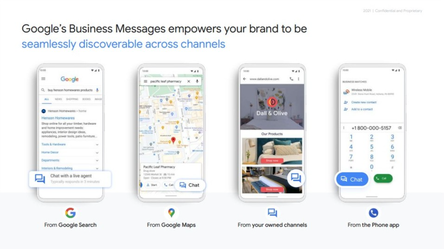 It doesn’t waste time, right from the start, it shows off the unique value proposition of Business Messages and what it looks like in action. Side-by-side comparisons visually prove Google’s promise of “meeting customers where they are.”