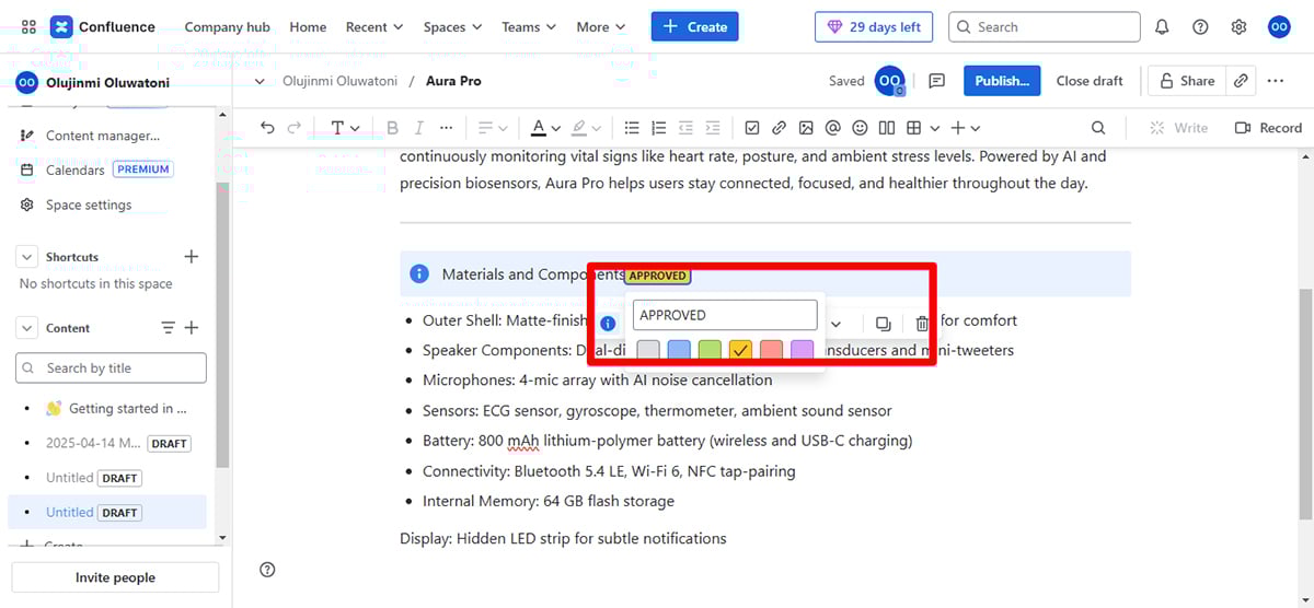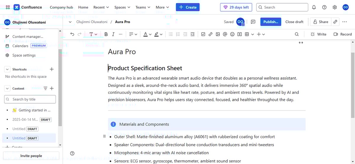 Overall, Confluence works well if your focus is more on practicality and collaboration rather than visual design. But if your aim is to create a specification sheet that’s design-heavy or highly polished, it may fall short due to its limited design assets and styling options.