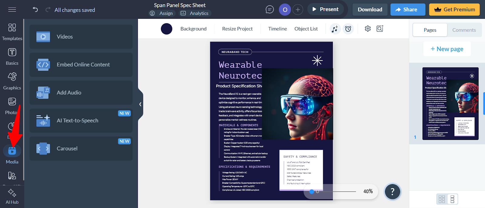 Like Visme, Canva also offers Resize and Magic Switch tools which help you adapt your spec sheet for different platforms or switch up the layout.