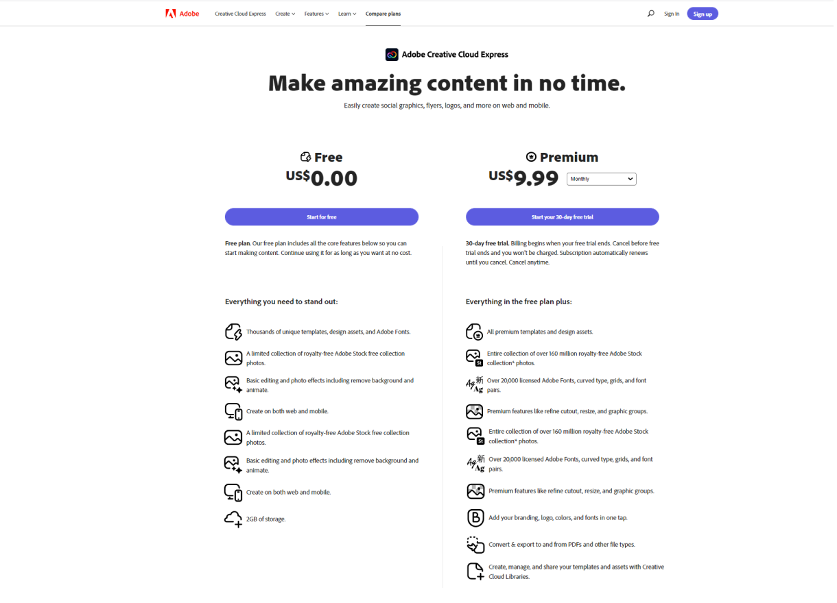 Adobe Creative Cloud Express, sosyal medya içeriğini kolay ve hızlı bir şekilde oluşturmak isteyenler için en iyisidir. Ücretsiz plan tüm temel özellikleri içerir, böylece hemen içerik oluşturmaya başlayabilirsiniz. Premium abonelik, markanızı, logonuzu, renklerinizi ve yazı tiplerinizi tek bir dokunuşla eklemenize olanak tanır ve sınıf eğitimi için ücretsiz bir Creative Cloud Express Programı mevcuttur.