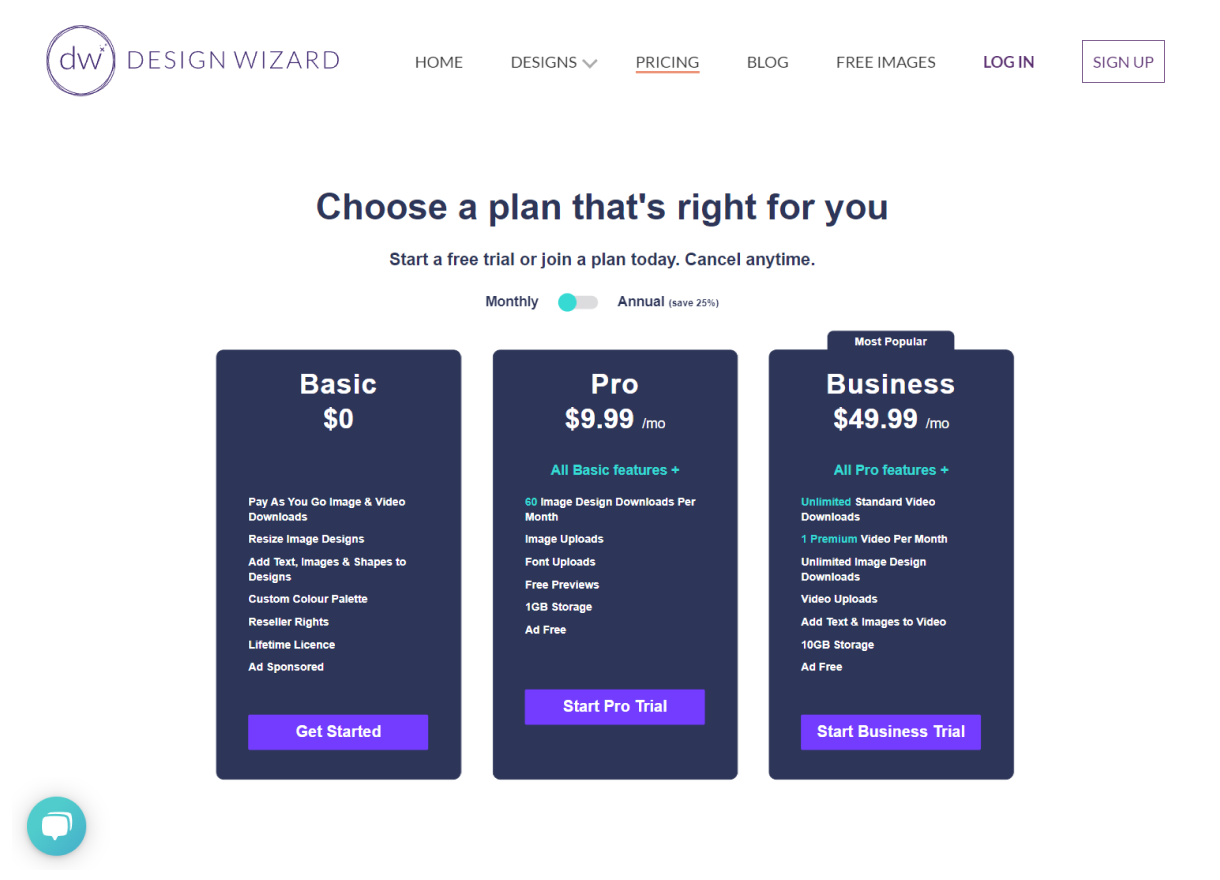 Design Wizard üç plan sunar; biri ücretsiz, ikisi ücretli. Temel plan, kullandıkça öde özellikleriyle ücretsizdir, bu nedenle yeni başlıyorsanız ve deniyorsanız iyi bir seçimdir.
