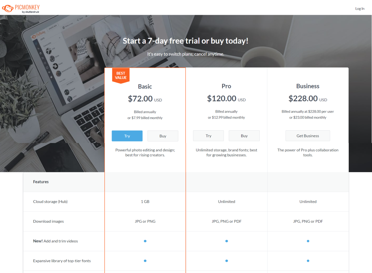 PicMonkey ücretsiz bir abonelik sunmaz. Ücretli katmanlar aşağıdaki gibidir: