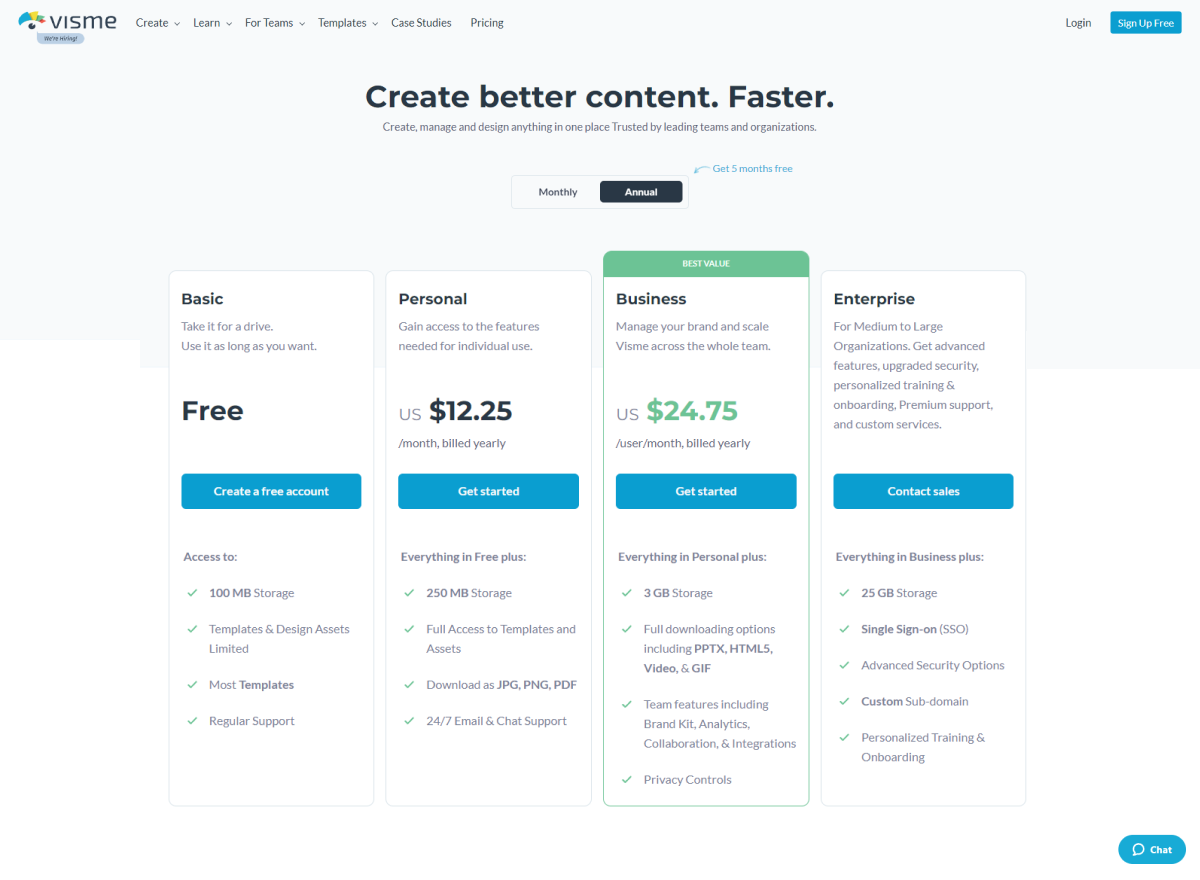 Görsel grafik tasarıma yeni başlıyorsanız Visme'nin Standart planı idealdir, ancak kesintisiz tasarım özellikleri için İşletme en iyi seçiminizdir.