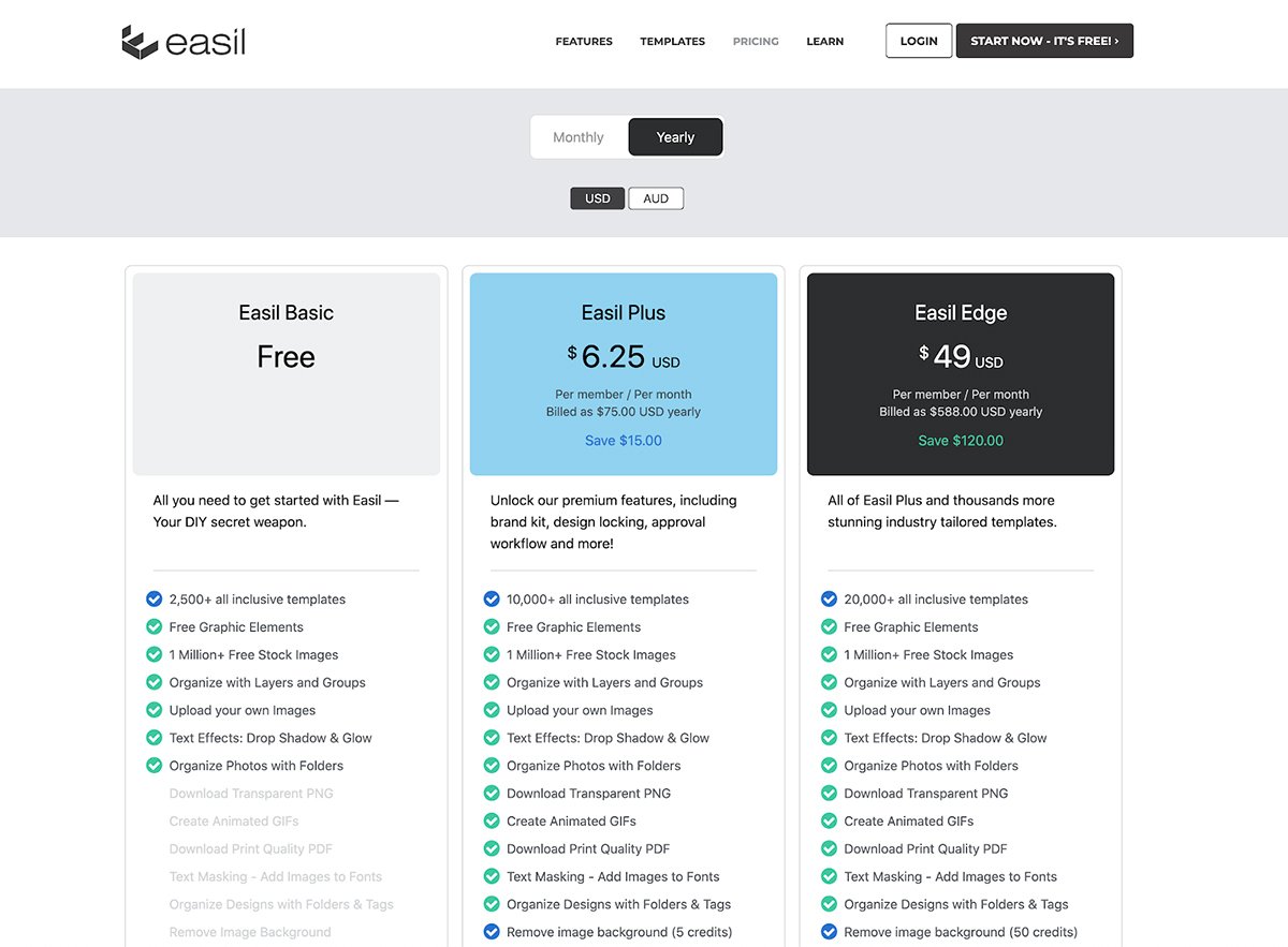 Easil'in dört planı vardır; biri ücretsiz, üçü ücretli. Ücretsiz plan, 30 günlük ücretsiz Plus denemesini içerir ve özel fiyatlandırmaya sahip en büyük plan, özel bir hesap yöneticisi yardımı ve grafik tasarım oluşturma için birçok seçenek sunar.