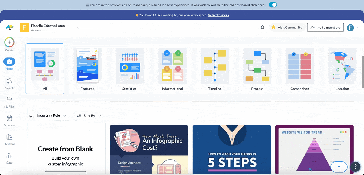 Visme offers a wide variety of infographic templates tailored for different topics, industries and goals. To get started, sign up or log in to your Visme account and create a new project. Head to the infographic section, browse the available templates and choose one that fits your message and audience.