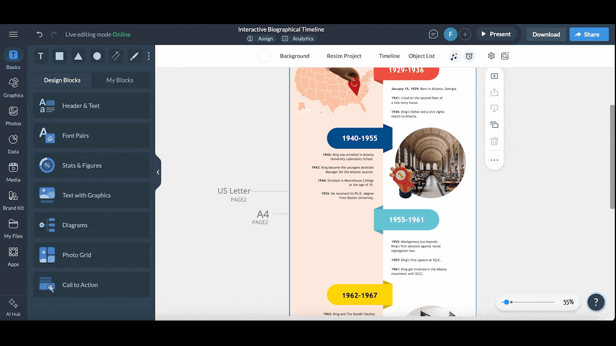 Visme offers a variety of timeline elements like date markers, zigzag or spiral paths, color-coded segments and animated sequences to help you build a timeline that fits your story.