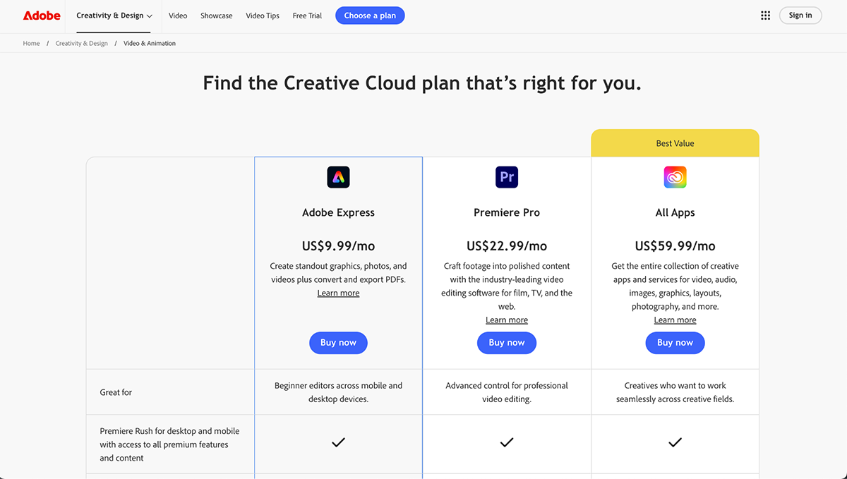 Premiere Rush is available as a standalone app, as part of Adobe Express or the All App Creative Cloud.