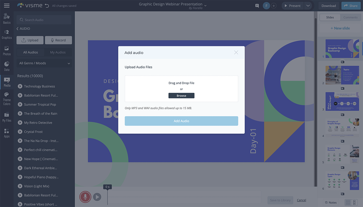 If you’re using Visme to create a corporate or sales video for your brand, you can directly upload your audio files to Visme’s editor. This can effectively save you tons of time and can even boost your productivity.