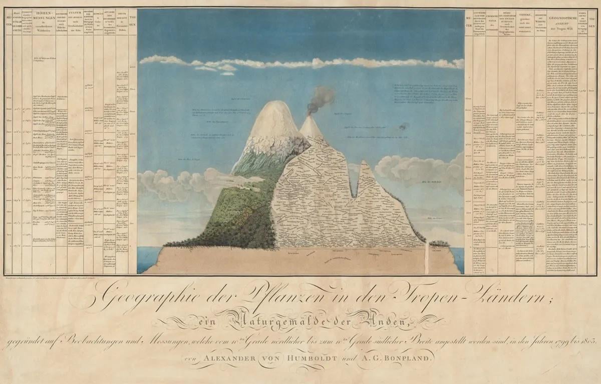 In the early 1800s, explorer Alexander Von Humboldt created Naturgemälde, a data-centric painting about the Chimborazo volcano, including the plant species and weather patterns in the area. According to some historians, it’s “a diagram and a work of art that might be considered history’s first infographic.”