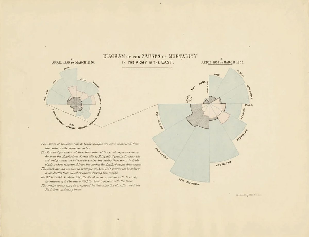 As data analysis became more widespread, so did infographics. By the end of the 19th century, Florence Nightingale, an army nurse, together with a team of expert statisticians, published infographics that helped improve public health. This is the Rose Diagram, one of their infographics, which visualizes the mortality rate and causes of soldiers in the army.