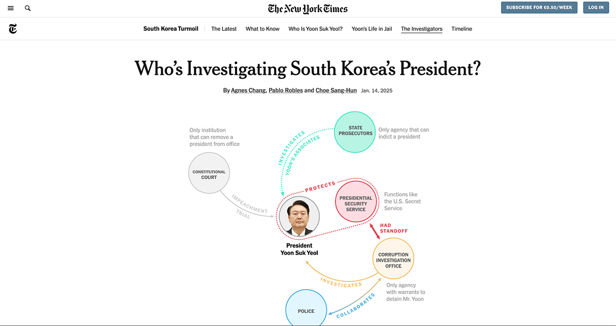 The growth of infographics in the media helped coin the term “ data journalism.” Data journalists analyze data and write stories rich with infographic visuals. Like, for example, this article from The New York Times about South Korea’s president.