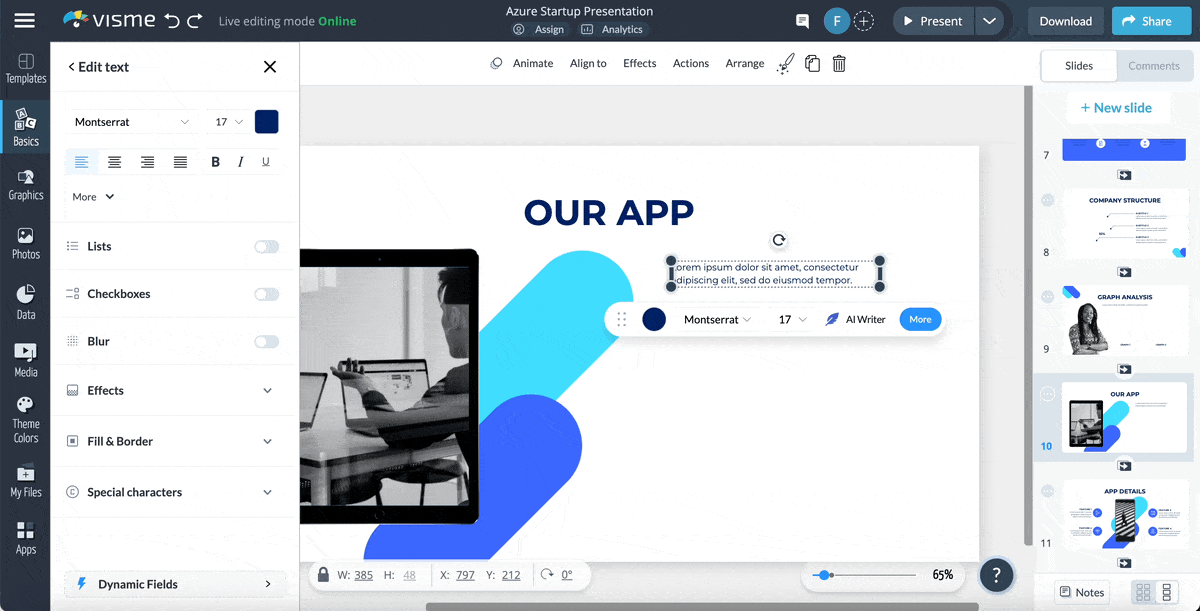 Use features like built-in graphics, custom 3D characters, animations, branding and AI-powered tools to create the best business plan presentation you could envision.