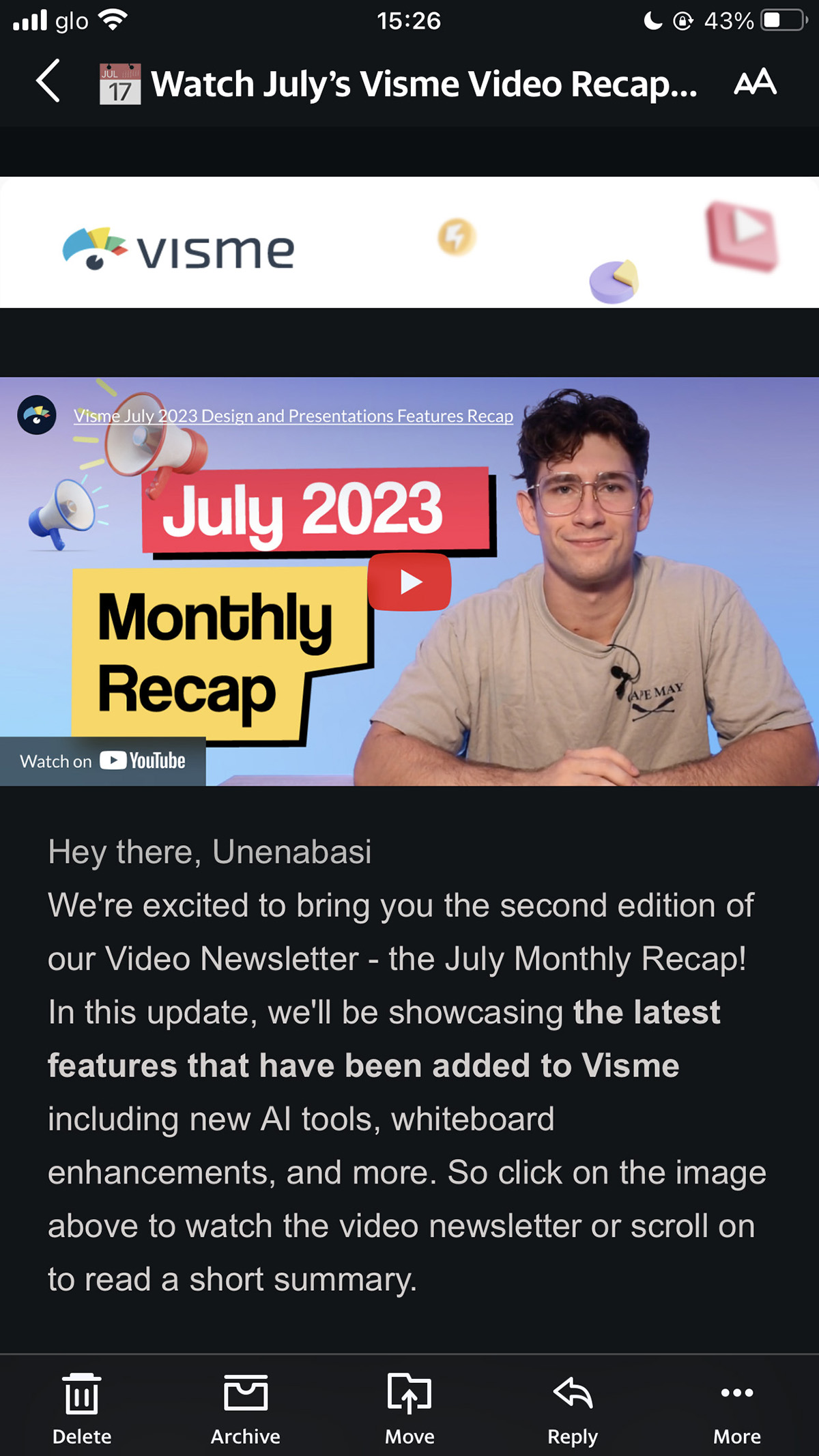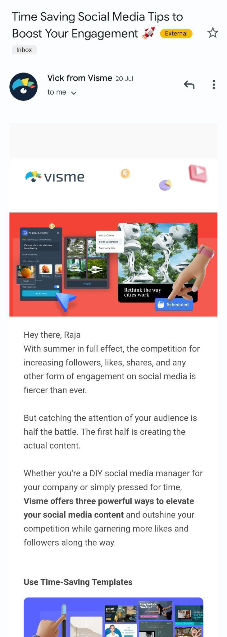 Here’s an example of a mobile-optimized email from Visme. This email contains a YouTube video, text boxes and images that display optimally on a mobile screen.