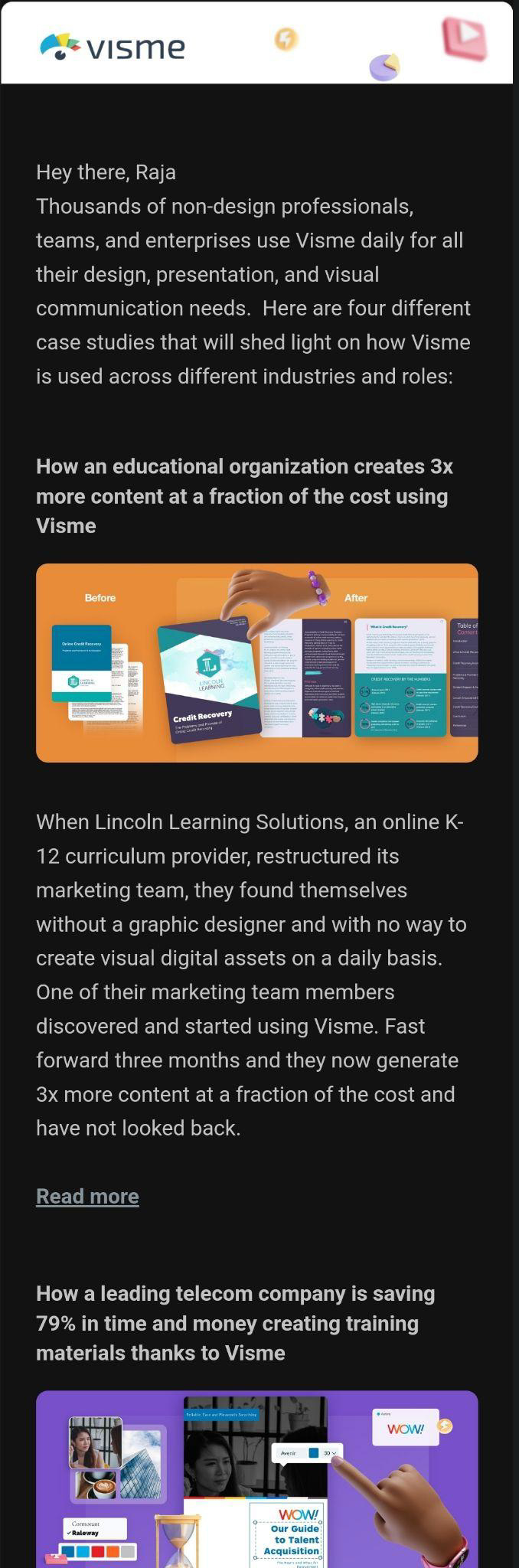 At Visme, we understand the importance of not just telling but showing how our tools and services can make a difference. That's why we regularly feature customer success stories in our newsletters.