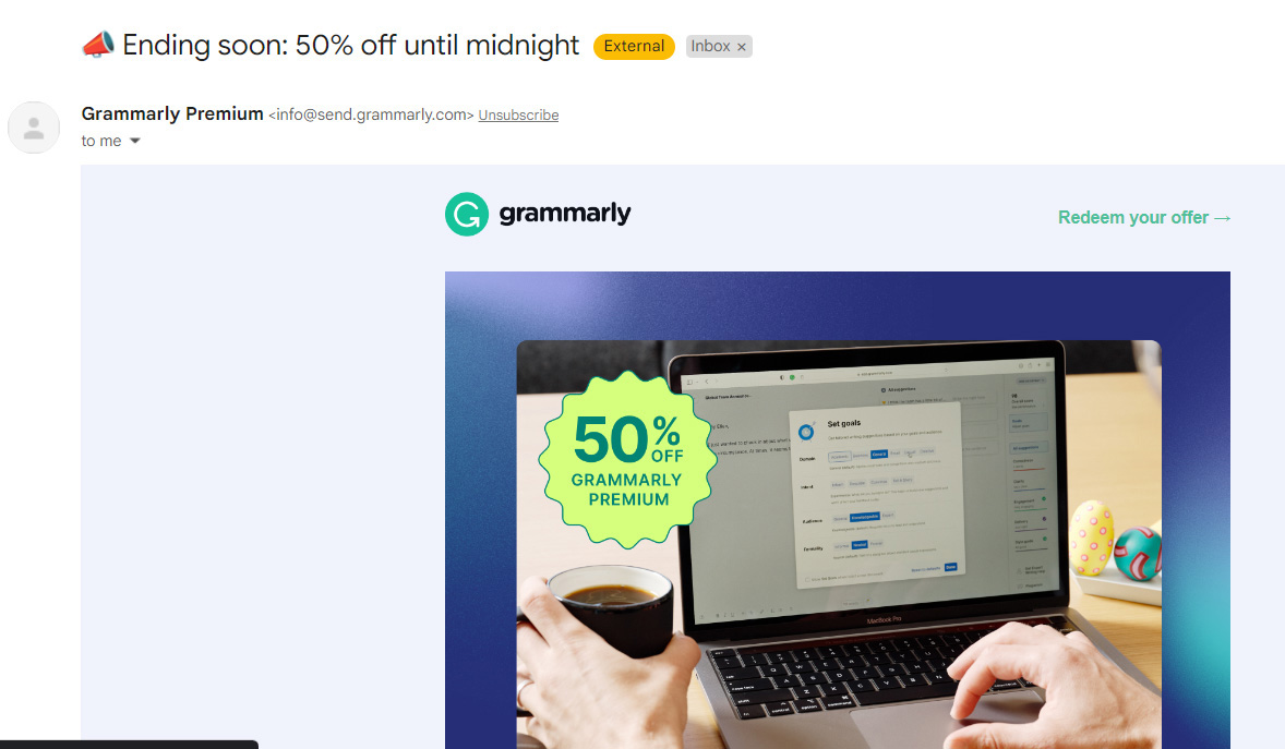 Here’s an example of Grammarly’s email subject line that starts with “Ending Soon” to create urgency.