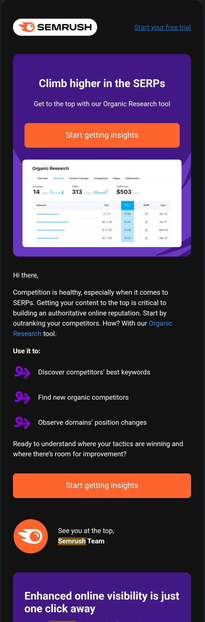 Here's an example email from the SEO platform Semrush. They seamlessly incorporate their brand colors, blue and orange and use specific font styles in each email they send.