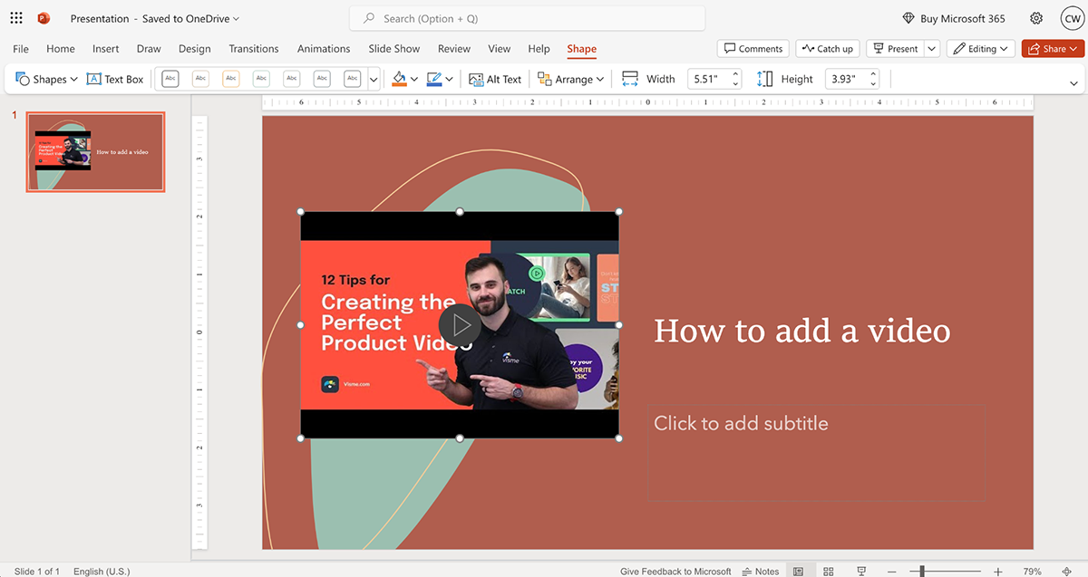 When embedding videos, help them feel like a native part of the slide by adding shapes and other design elements around your video. Here’s an example of what you could do with shapes: