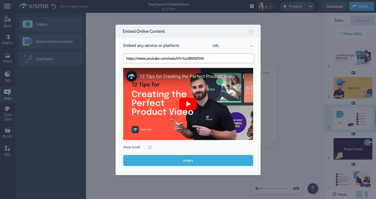 Click Online Video and a pop-up will appear for you to paste your video of choice’s link. A preview of the video will auto-populate so you can ensure you’re adding in the right one. Then click Insert.
