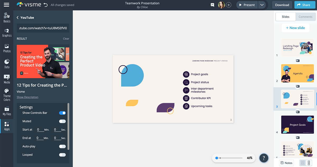Videos are a great way to take your presentations to the next level. Whether you record yourself speaking, use an online video or create a video with Visme to embed in your presentation, the possibilities are endless.