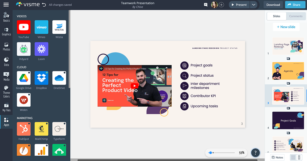 Throughout this article, we’ll walk you through inputting video content into PowerPoint slides and Visme slides and how to make the most of incorporating video into your presentation.